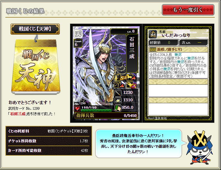 果心異境の報酬を引いてみたら今期 覇の石田三成降臨! 防御無尽を持っている二人しかいないんだが… また5月の天追加で出す予定なんだろう