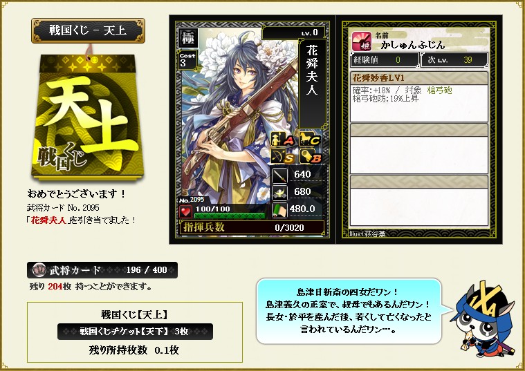 #568 姫くじ&天上くじをひいた2 2015/2/17 0:06 9章, くじ履歴 54土田御前 53豪姫 52豪姫 51お梶の方 50虎御前 49阿南姫 47+48鶴姫 45+46 41-44井伊直虎 37-40伊勢龍姫 33-36土田御前 17-32京極マリア 1-16駒姫 初の極が来たと思ったらメインで上だよ。最後まで酷かった さて片鱗が30枚貯まりました。白いの来ておくれーლ(́◕◞౪◟◕ლ) 花舜夫人…。。。姫くじが配られている最悪なタイミングだw 別の防御姫ならなんでも良かったのに