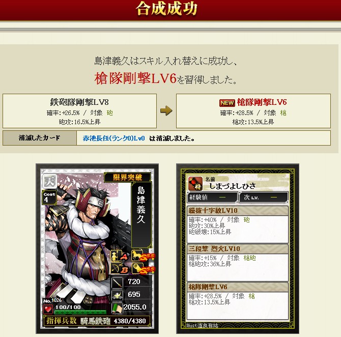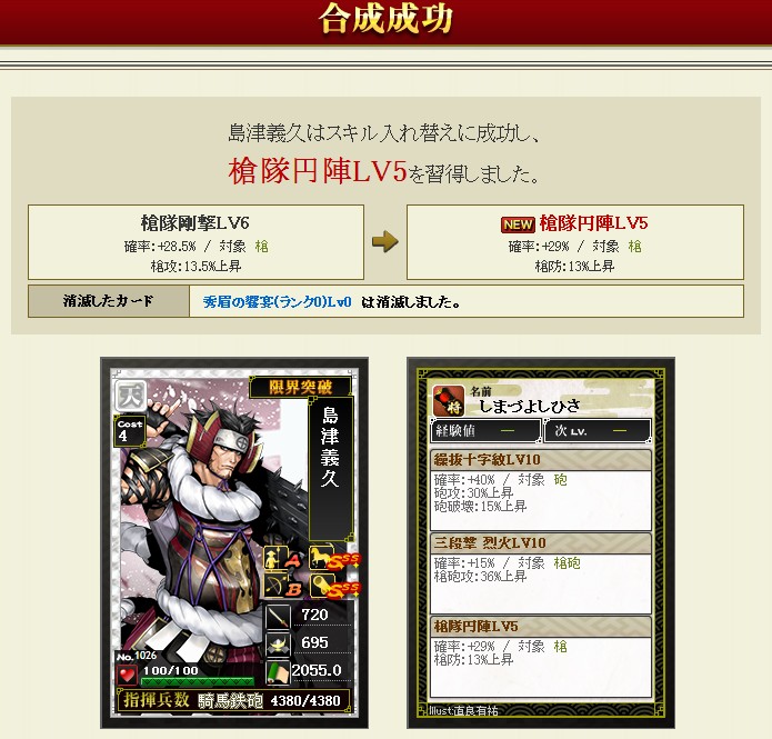 #579 秀眉の饗宴 2015/3/14 12:29 9章, 合成記録 日付が変わってプレゼントボックスに入ってました 合成候補は A槍隊円陣 B矢雨備え C六字の采配 S1声遣縦横 どこから来たんだ槍隊円陣w 嫌がらせ過ぎる 声遣縦横を出すためにまずは円陣をつけよう… ぶひょー!それじゃない~ こういう時だけ成功する もうこうなったら六字の采配狙いだ ギャース!!w