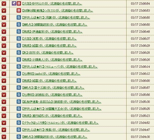 #580 武田防衛戦 2015/3/18 19:08 9章, 合戦記録 武田防衛戦でした。勝利~ 陣張りから鯖が激重。速攻で出した部隊が陣張らずに帰ってきました 陣張りと出城出しが重なったせいでしょうな その対応が「しばらく待て」この運営…次の合戦もヤバイですね 土日合戦ですから防衛部隊だけは置いておかないと 合戦は結構、攻められて防御P大量ゲット 今回は影の成績が良かったです。 23時の影は遠めにしか陣がなく、ダメ元で送ったら奇跡の陥落1秒前着弾 片鱗ゲット!落とした人は貰えてなかった ウマス