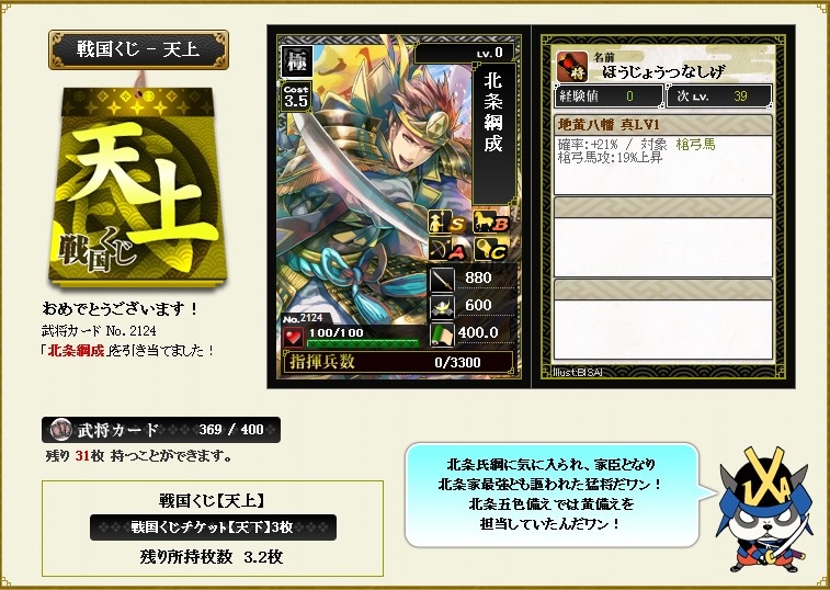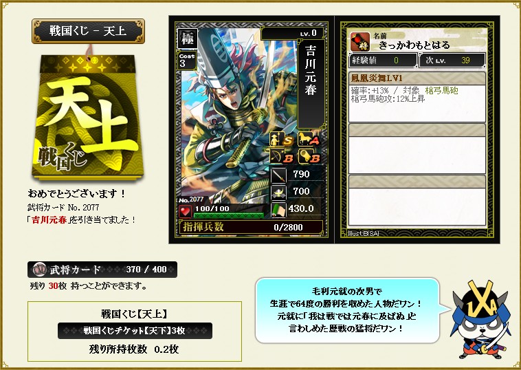 #594 10章開始+天上くじ 2015/5/19 0:00 10章, くじ履歴 繰り返しクエストとやらでいきなり33342取れました 天狗と鬼の能力は変わってなさそう 弓騎馬と武士の強化で今期は波乱になりそうですね さて天上くじ×2。さくっと引く 北条綱成 これは中々良いだろう 吉川元春 こいつは!ハズレだw てか絵師が同じで構図も同じw 酷すぎ~ この演出w イラっとくるな