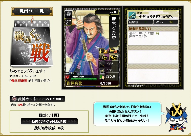 #595 龍造寺隆信 2015/5/22 17:31 10章, 取引記録, 天取引 隠し玉がないので銅銭が余っているのと戦くじから宇喜多直家やYさんが出たりしたのでそれを売って天を買うことに狙いは弓騎馬対応武将。今期は弓騎馬隊を新設するぞ 弓騎馬隊を作ろうとすると北条氏康を赤備え隊に回したのが痛い 新上杉謙信か加藤清正なんかを候補にしてたら意外に新天の龍造寺が安いことが判明 しかも結構、出品多し。スキルが槍弓なのが嫌われたみたい 競り合いになるも落札ッ! 一期からお馴染みの龍造寺が遂に天になりましたw LV10で55%アップらしい。こら強いで ちなみにこれが一章の龍造寺。当時はむちゃくちゃ強かった