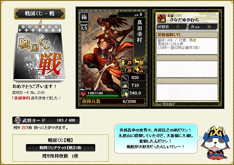 #602 今期初勝利 2015/6/22 18:55 10章, くじ履歴, 合戦記録 島津防衛戦でした。今期初勝利~ 長宗我部が強かっただけなのか?結構初日から行けそうだった 赤備えの研究が終わったが生産が低くて砲まで手が回らない 生産が未だに2万にも届きませんわ さて合戦報酬の戦くじからまた出ました 新規追加された第四形態の幸村さんでした プラチナ幸村をちょい弱めにした感じ 丹羽、成実と似たり寄ったりですな