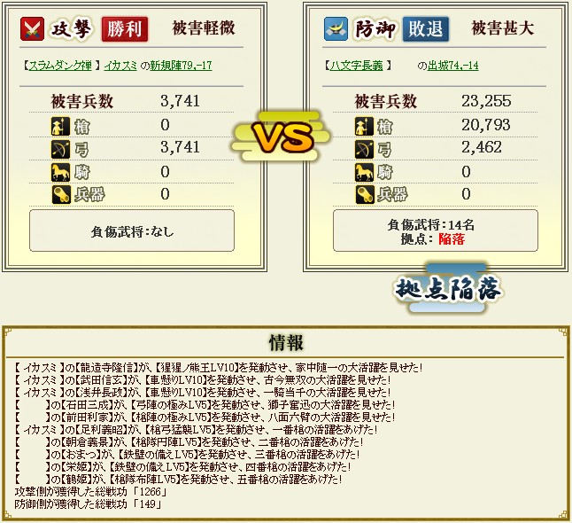 #603 弓騎馬隊、発射 2015/7/16 19:12 10章, 合戦記録 ネタもなく、しばし放置しておりました ようやく弓騎馬の研究が終了しまして攻撃参加させてます そんな中、出したばっかりの出城を発見!早速弓騎馬部隊、発射 赤備えで突っ込んだ先陣たちが次々に弾かれていく これは着弾した方がちと気まずい。だが遂に着弾時間に 炸裂!ウマイヨ~ しかし出城の場所を任意で選べるようになって陣張りが難しいですな