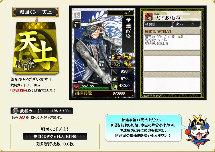 #616 大勝利 2015/9/26 17:37 10章, くじ履歴 今回の合戦で片鱗5枚ゲットし一気に天上くじまで持って行きました まさかの戦くじからトリプル極! これはもう引くしかない おお~天確定のメッセージ! ・ ・ ・ ・ ・ ・ ・ ・ ・ ・ 伊達ぽよ~ 今でも一軍の旧伊達がいるからちと微妙かな 旧伊達は今でも取引で人気だから良スキルつけて旧伊達を売るというのはありだな まさに鬼引き