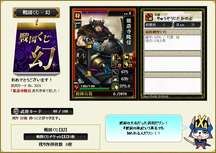 #640 幻くじ一気引き 2016/1/13 22:50 11章, くじ履歴 今回の新武将、素材武将がどんどん更新されていきますね そういえば梶原政景は戦くじから全く出なくなった。半年ぐらい出てないかも 恒例の幻くじ一気引き 58 5064 渡辺勘兵衛 57 3024 龍造寺隆信 56 3050 愛姫 53+54 4070 志賀親次 49+50 3119 直江兼続 45-48 3038 お市 41-44 5036 吉弘鑑理 33-40 5063 大久保忠世 17-32 3155 稲富一夢 1-16 5050 蒲生氏郷 今回もクソでした 懐かしのクマー^^