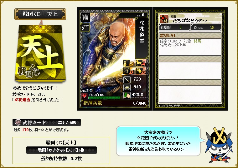 #654 銅銭武将排出停止前の天上くじ 2016/3/ 7 19:21 11章, くじ履歴 緊急メンテが続いてますが… 銅銭武将の排出停止前に天上くじで最後のチャンス 戦くじは10枚全部上だったw 絞り倒しやがってこうなったら天上で蒲生狙い うおおおおー ピッカリ^^ ぐあああああー夢も希望もない 定期メンテ明けに引いてたらもしかしたら帰ってきてかもw クソー