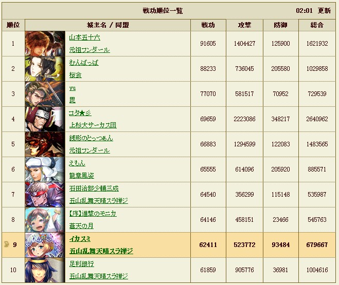 #657 連続10傑入り 2016/3/24 20:06 11章, 合戦記録 盟主攻めに積極的に参加して連続10傑入り。今回は勝ち戦の10傑入り 陥落の戦功が1~2万とか貰えるのはデカイ 大殿からお褒めの言葉を貰いました。