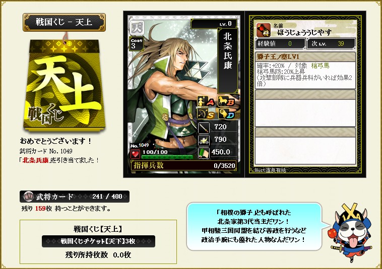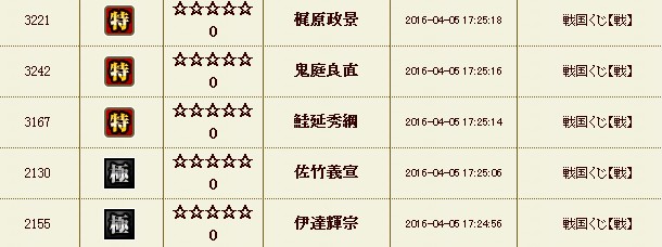 #659 4月の天上くじ 2016/4/ 5 17:49 11章, くじ履歴 先月の緊急メンテに期待してメンテ後に一気に戦くじ引き まさかの極連発からの特3連。これは滅多にないこと メイン鯖でもいきなり安藤守就を引く引き強っぷり これは行けるかも…吉乃欲しい 特を溶かして強引に天上くじを引くっ まさかの天確定メッセきたー 氏康ぅ~ガァァァ… 三好だったら、三好だったら まあ使えるけどね(`・ω・´)b 名人つけてマルチに活躍させたいな~