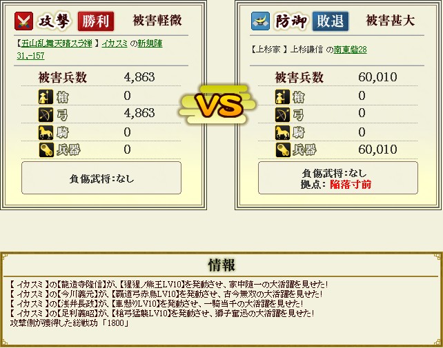 #661 進化する者 2016/4/23 13:25 11章, 合戦記録 今回の影武者で一戦撃破更新しました かなり遅れての参戦だったので鉄足が残ると踏んで弓騎馬で行ったがスキルフル発動か?スゴ過ぎ~ でも今回、本領が落とされてしまった 出陣元に高速で陣を寄せたのに加勢が入ってたし勝てると踏んでポイント欲しさに奇襲を躊躇ってしまったw 1-16鯖で最近、やたらと出てくる序や上の破壊武将を一人落札してみました 先に入札があったが諦めずに限度額で入札したら落札できてた 大動員があれば破壊部隊はいらないよね