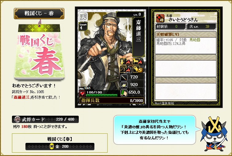 #662 春くじ 2016/4/25 18:13 11章, くじ履歴 今年も来た春くじ。今年は高橋Pがあるからありがたみも半減 高橋Pは期間限定じゃないみたいなので刷新まで使わずに置いておきましょう でも一応金購入 キマシタ! ノー 最近出たばっかり 33-48 鳥居元忠★1+隠し玉★2 17-32 斎藤道三+えちご★3 1-16 松平清康★2+兵右衛門 特にも星がつく様になったみたい メインで来てくれれば…でもくじ運上昇期だ。次に期待