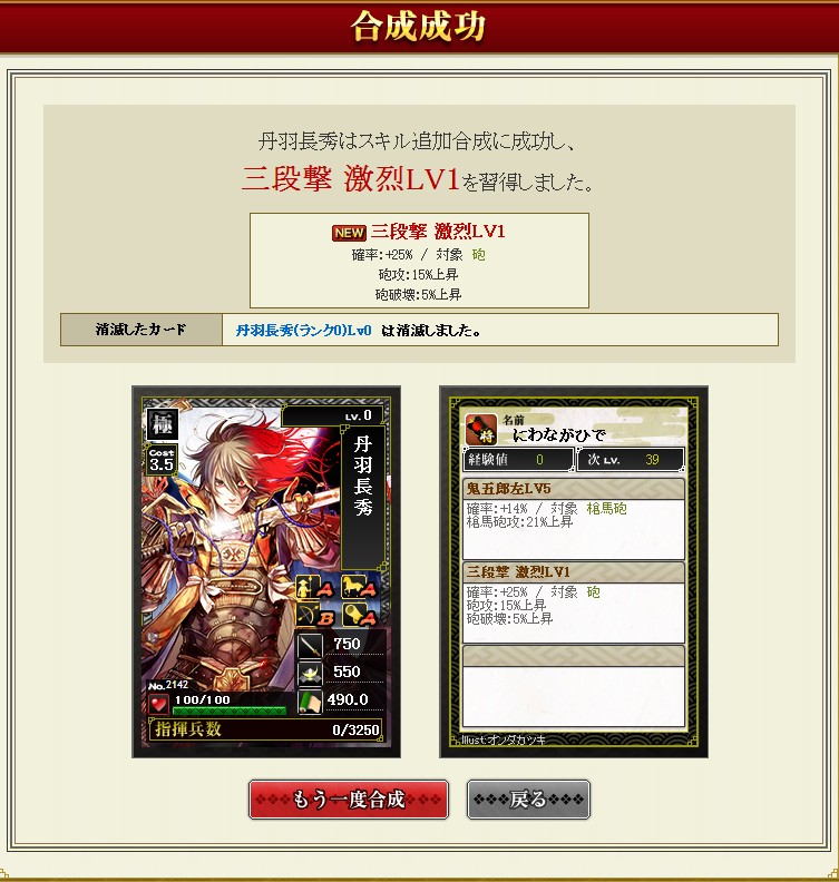 #665 順位確定 2016/5/11 18:22 11章, くじ履歴, 合成記録, 合戦記録 11章も最終合戦を迎えました。 3期ぶりに30位以内に返り咲きました 今期は本領の場所が味方と離れてたので序盤は良く落とされてた 攻撃ポイントがかなり伸びてます。かなり攻撃的 くじは散々でした 前期は戦くじから16枚引けた極が今期は7枚に激減 特は多めだったけど。高級素材ではないのが多かった 藤堂のおかげで白くじを引いた回数が4倍になりました サブ鯖での成功例。メインに移して~