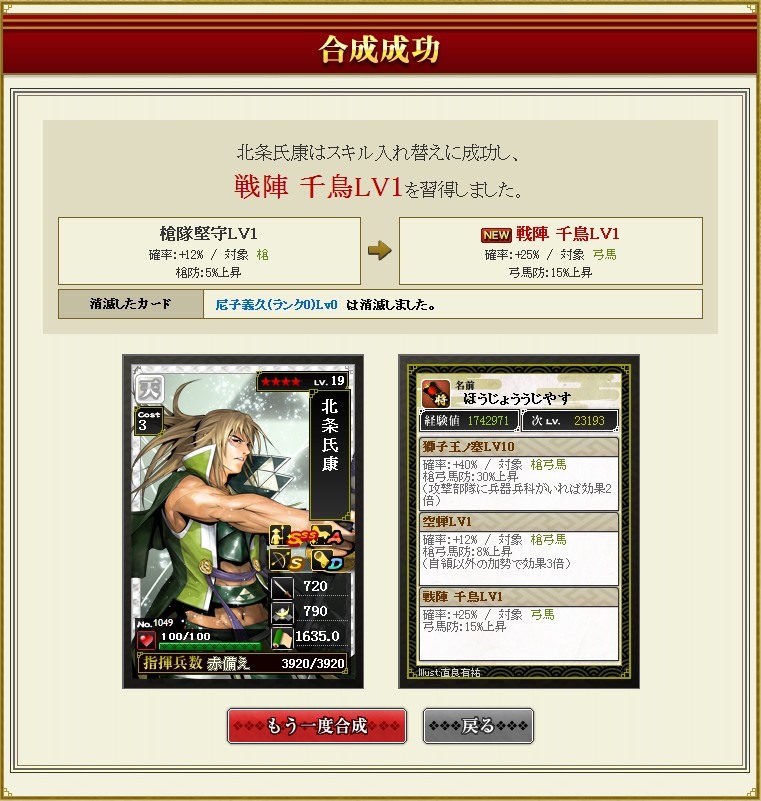 #666 北条氏康完成 2016/5/17 18:18 11章, 合成記録 白くじを引いてたら素材がいくつか出てきたので北条氏康の完成を目指す まず空蝉がつき、極みがついた上から戦陣 千鳥!笑いが止まらん 自領以外で砲で攻めてきた場合、126%アップですわ ソロ防衛だと若干弱いが、馬防で運用するから加勢は入れ易い 12章は新天12枚追加。どれも壊れ性能だろうな