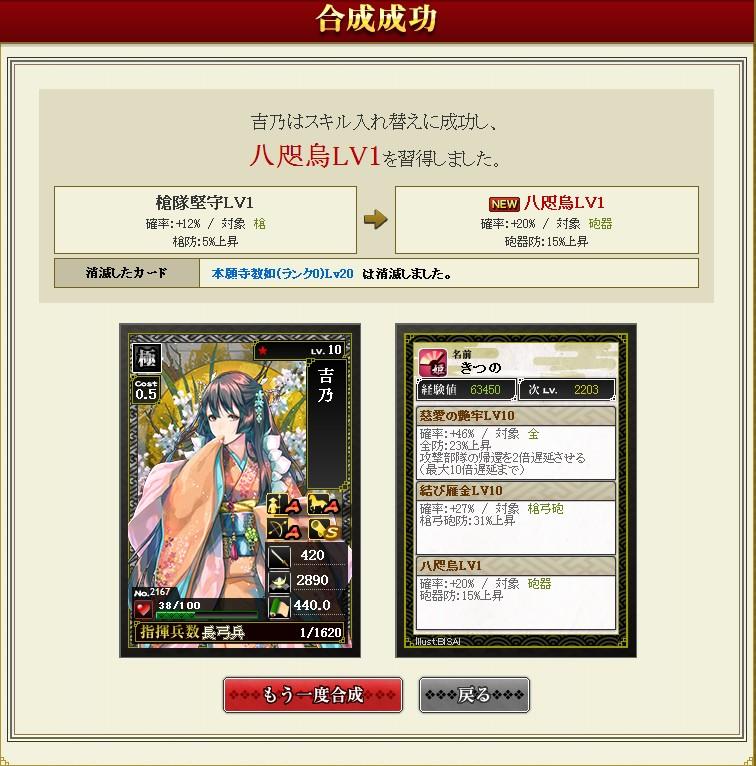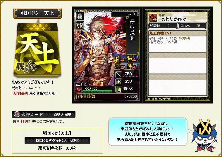 #672 また天上くじ 2016/6/10 18:13 12章, くじ履歴 片鱗が1枚足りなかったので特で確保しようとしたら銅銭で4連続成功 これがixaクオリティー でもおかげで吉乃に八咫烏がついた 吉乃も移動速度が早くなったのでそこまで凶悪性能じゃなくなったか? むしろコスト0.5の方が有用かも 前回、調子が良かったので天上くじに期待したが… 丹羽長秀…。至って微妙な 太原雪斎が出なくなったのに。新天を引きたいのぉ~ ●