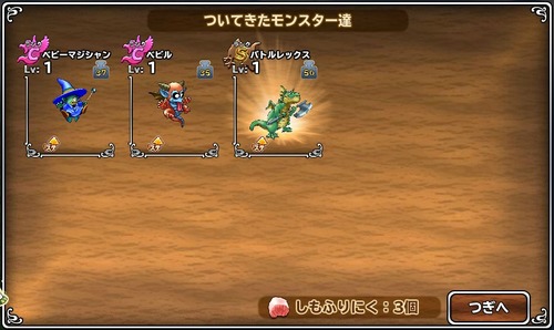 前回の失敗からスライム斬り、ベタン、ザオリクを用意し700日目のログインボーナスのタマゴロンを竜王に配合してから挑戦(バギの心得と吹雪ブレスの心得)