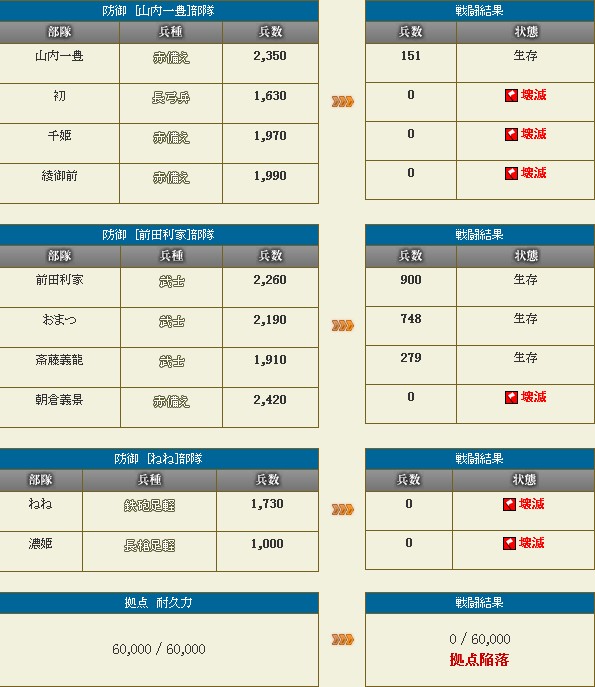 北条攻め中です。10合流の前に久しぶりに陥落しました。 各部隊の損害は画像が多いので続く…